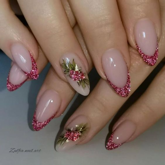 Поскольку Новый год ассоциируется с сиянием гирлянд, елочных игрушек и мишуры, то и маникюр часто выполняют с использованием блесток. Это могут быть различные варианты втирок, использование глиттера, фольги, или просто покрытие с глянцевым блеском.