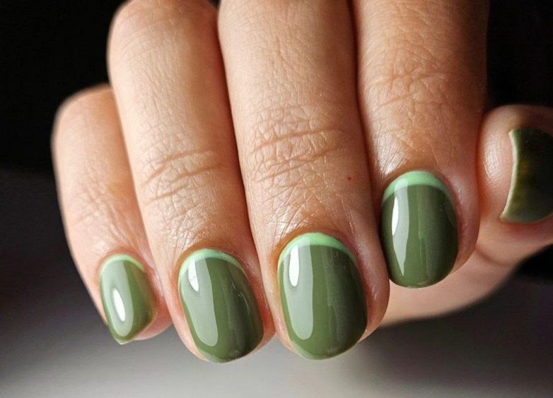 Лунный маникюр в модном оливковом цвете с нежными мятными лунками.