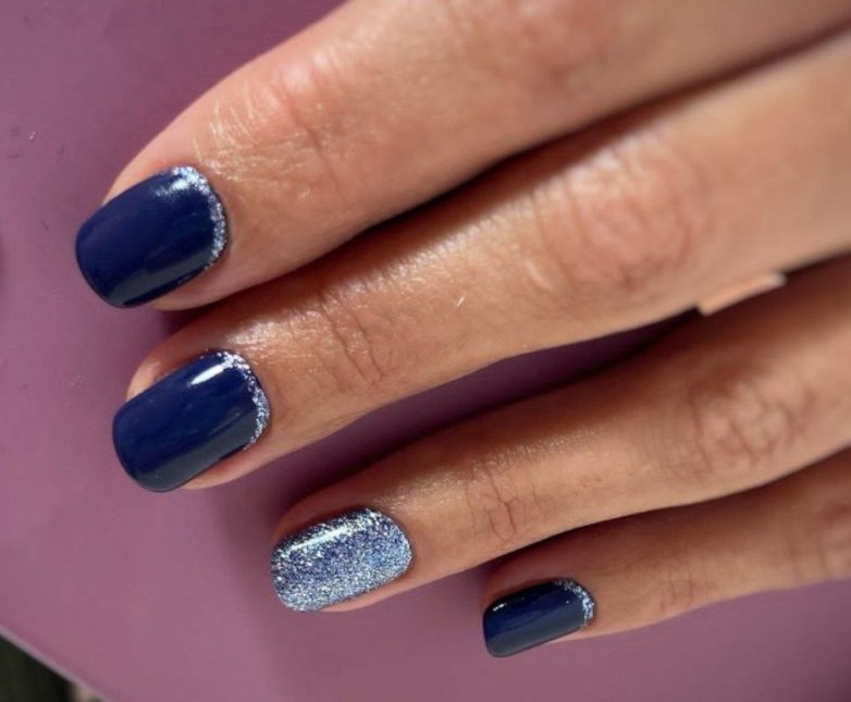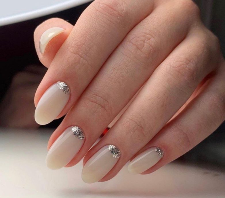 Глиттерные лаки на лунках очень освежают маникюр. Можно комбинировать их с кремовыми глянцевыми лаками без блесток, на контрасте они смотрятся красиво.