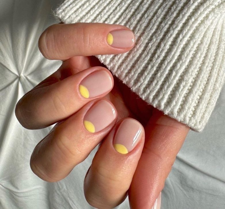 Если выделить лунки жизнерадостным цветом – например, лимонным или персиковым, обратный френч заиграет новыми красками.