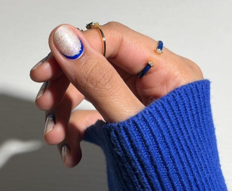 Небесно-синий цвет комплиментарно смотрится на лунках ногтей, в отличие, например, от красного, который может придать кутикуле воспаленный вид.