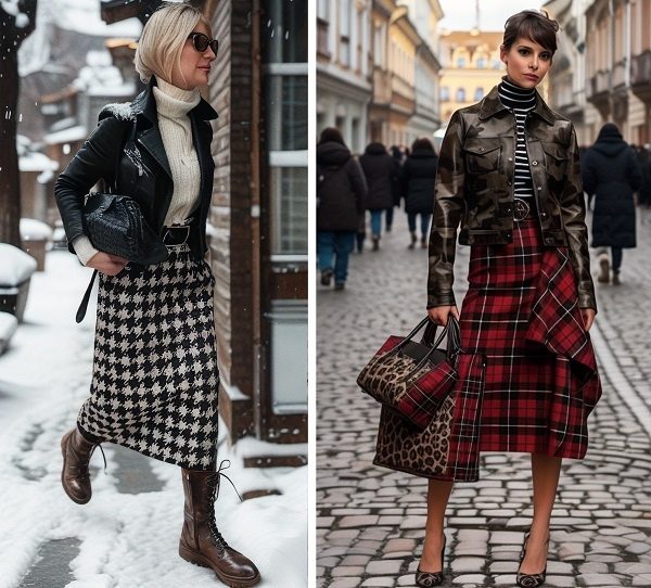 Клетка — это не просто принт, это как уютный плед, который можно носить на себе. Клетчатая юбка выглядит так, будто её нарисовали для уютных зимних дней. Этой зимой особенно актуальны шотландские узоры и «гленчек», которые идеально смотрятся с базовыми свитерами и рубашками.