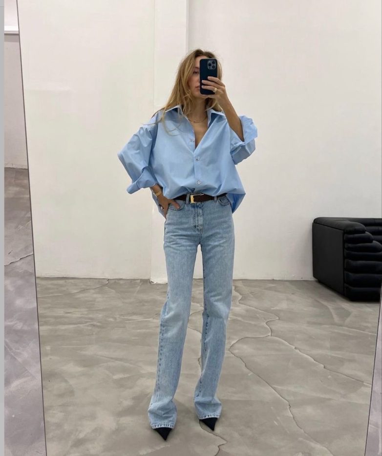 Любимые джинсы стилизуй с качественной хлопковой белой рубашкой (Арт. на WB: 218037148), балетками и маленькой кожаной сумкой. Очень простой образ, который остается в топе классики много лет.
