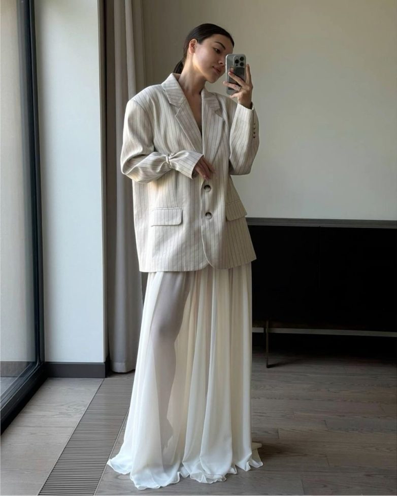 Бери платье прямого силуэта, добавляй к нему пиджак оверсайз, для пикантности – сумочку контрастного оттенка и любую обувь на каблуке! С аксессуарами, как с бесполезным предметом в универе – можно не заморачиваться, ведь элегантные силуэты делают всю работу.