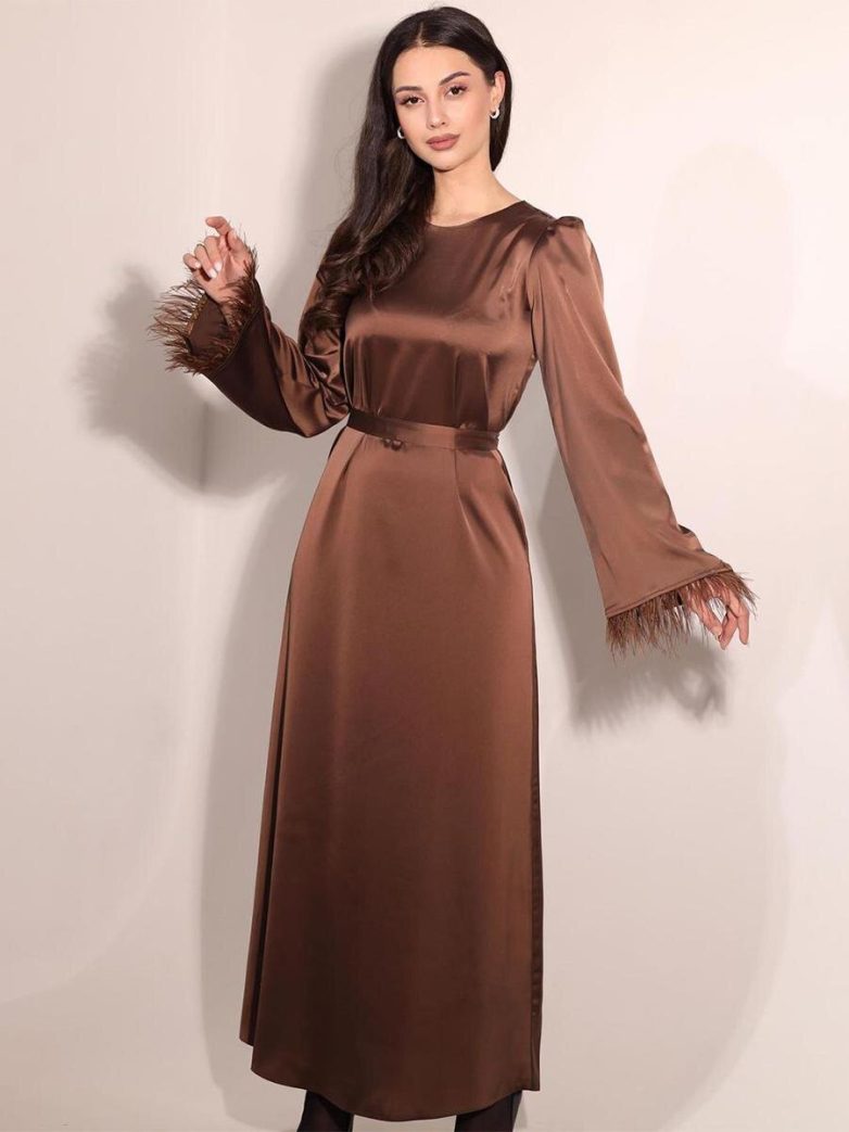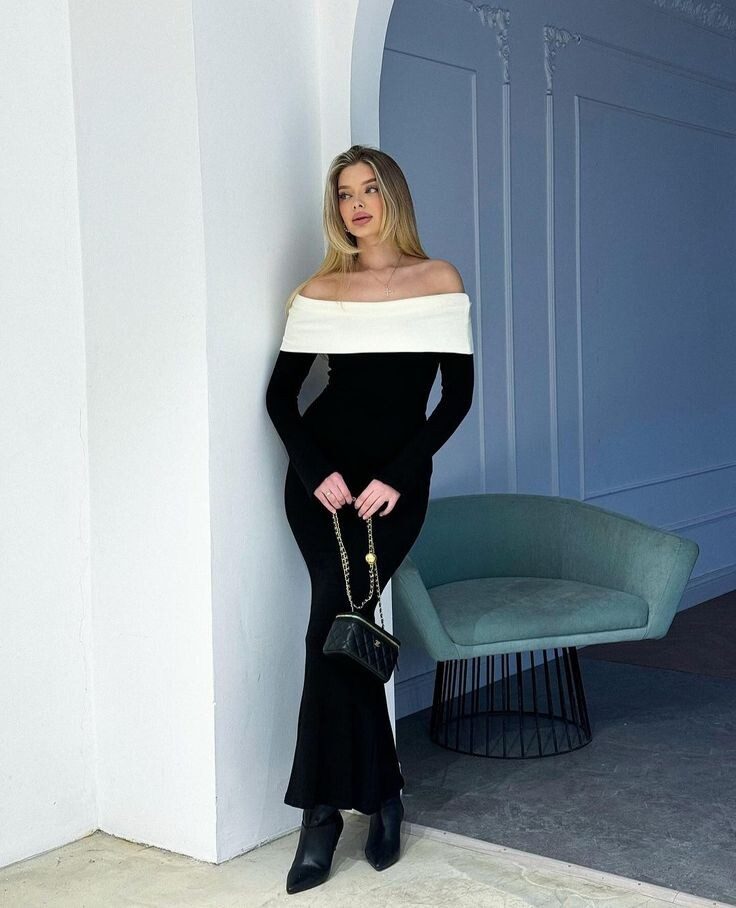 Это платье удивительно тем, что оно сочетает в себе изысканную женственность и чувственность, так как открывает именно ту часть тела, которая необходима. Вы можете надеть его на вечеринку или романтический ужин, дополнительно украсив шею и зону декольте роскошным ожерельем.
