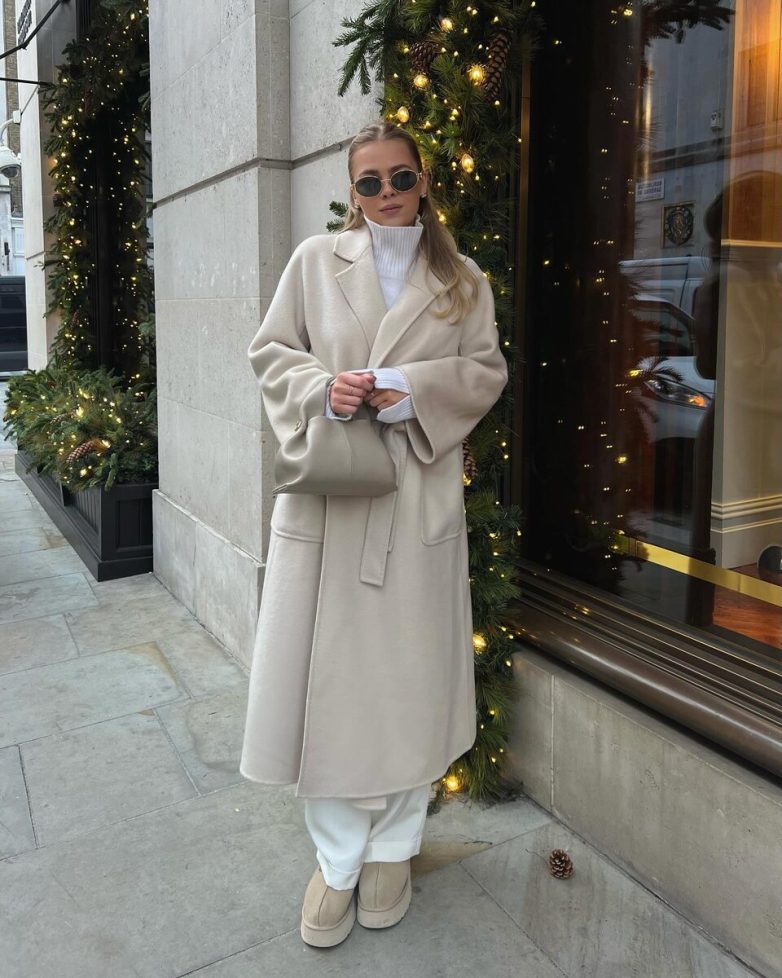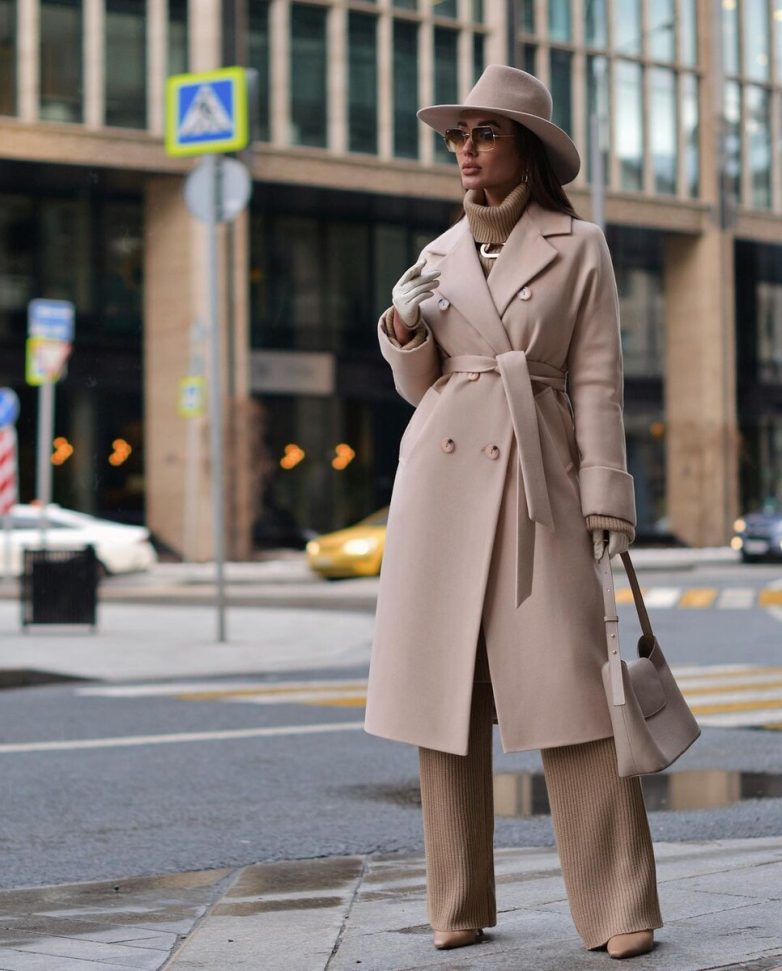 Универсальный вариант для долговечного теплого пальто — натуральная шерсть. Сейчас в большинство шерстяных тканей добавляют немного синтетических волокон для их большей прочности. Чтобы ваше пальто не скатывалось, выбирайте сочетание шерстяной ткани с добавлением до 30% полиэстера. Это предотвращает появление колтунов в областях локтей и ягодиц.И напоследок, подборка образов с пальто.