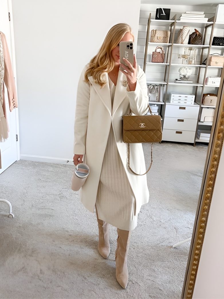 Обратите внимание! Пальто может быть короче вашей юбки или платья максимум на 5 см. В этом случае важно, чтобы они сочетались по цвету и создавали целостный образ.