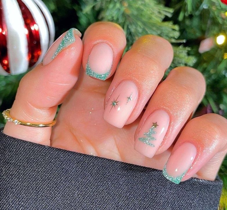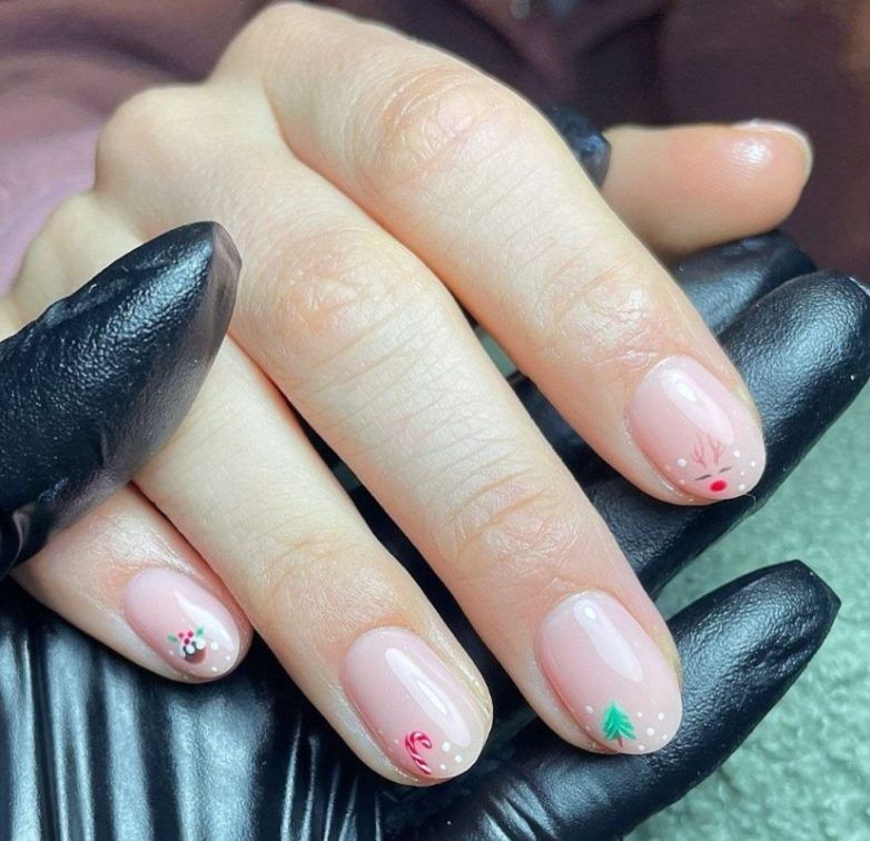 Удивительно, что нюд не отпускает нас и в праздничный период. Только теперь это не просто бежево-молочные ногти, а украшенные тоненьким, вручную отрисованным узором с елочками, оленями, новогодними украшениями.