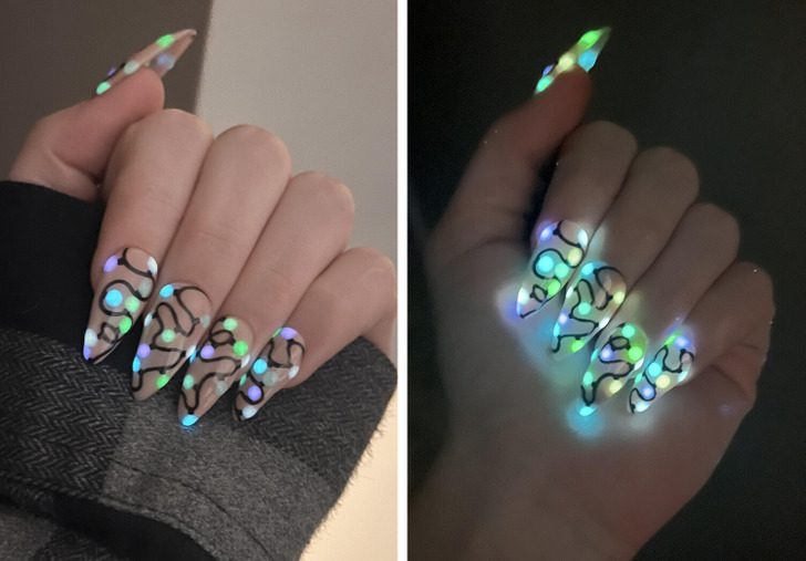 Вот вроде обычные с виду ногти, но стоит только поменять освещение, и происходит чудо!