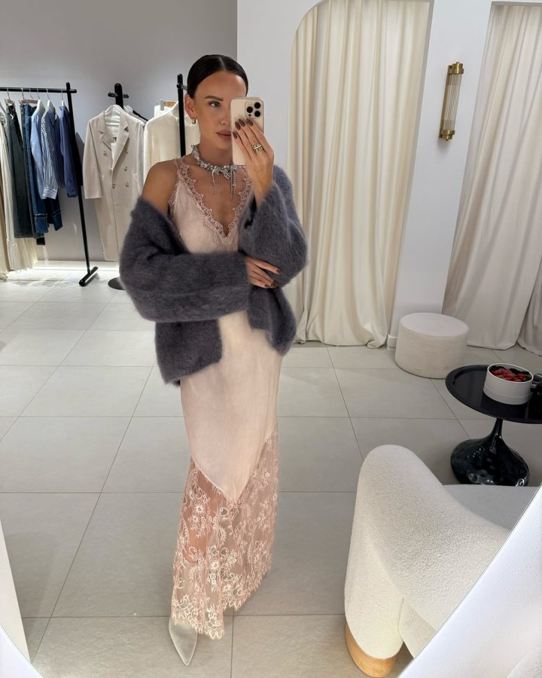 Роскошь и элегантность – вот главные слова, описывающие идеальный праздничный сет. Платье с кружевными вставками выглядит очень нарядно, утеплить образ можно не только верхней одеждой и теплой обувью, но и уютным кардиганом.