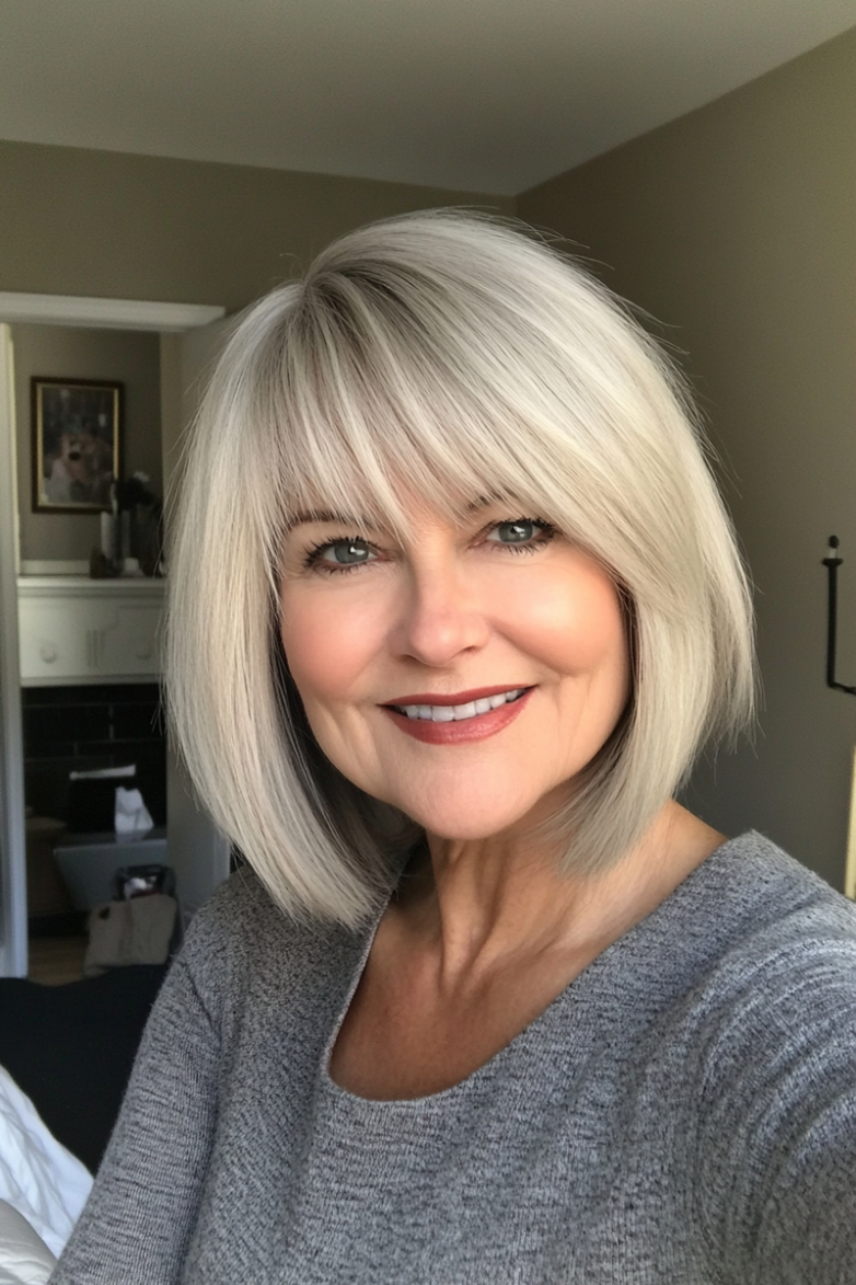Вогнутая стрижка боб с более короткой затылочной частью и более длинной передней создает выразительный силуэт. Градуированные слои придают волосам объем, что делает эту стрижку отличным выбором для обладательниц тонких волос. Холодный серебристый или пепельный блонд подчеркивает современный стиль этой стрижки.