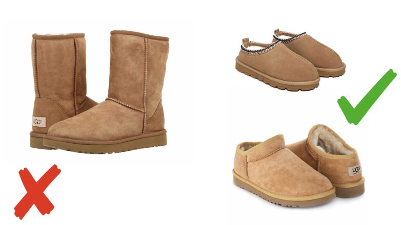 Выбирайте те же угги, но с усеченным голенищем. Они стали популярны пару сезонов назад, а главный их плюс в том, что они не режут ногу в месте наибольшего расширения. Есть даже вариации практически с отсутствующим задником — хороший вариант, правда не для прогулок в глубоком снегу.
