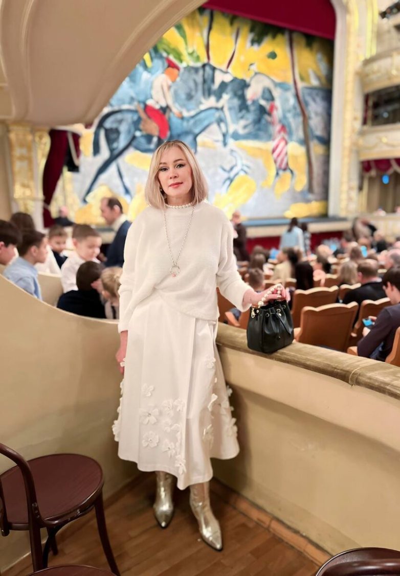 Светлый монохром – удачная идея для леди в возрасте. Так, комби белого джемпера, шифоновой юбки и высоких сапог заметно освежает внешность и образ в целом. Детали: сумка на цепочке, украшения.