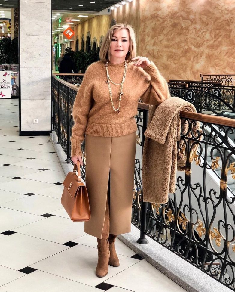 Одежда из трикотажа – верный способ согреться даже в сильные морозы. Чтобы было тепло и красиво, носите джемпер с бежевой юбкой-карандаш, фактурным пальто, высокими сапогами, сумкой.