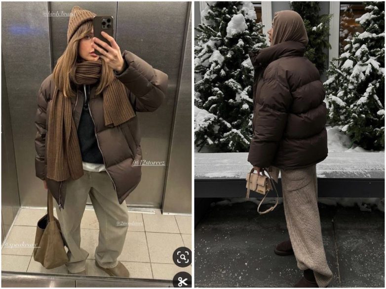 Коричневые свитеры, джемперы, джинсы, брюки, головные уборы, пуховики и даже шубы. Можно создавать тотал-коричневый образ.
