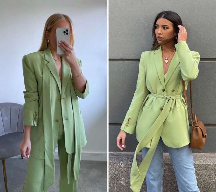 Например, фисташковый пиджак в сочетании с белыми брюками-кюлотами и бежевыми лодочками — отличный выбор для офиса или деловой встречи», — объясняет стилист.
