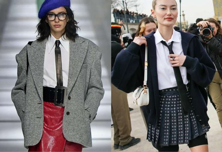 Тонкий галстук в стиле 80-х снова актуален. Его можно носить с белыми рубашками, жакетами оверсайз и даже с трикотажными топами. Такой аксессуар делает образ более собранным, но не строгим, особенно если повязать его чуть небрежно или сочетать с денимом.
