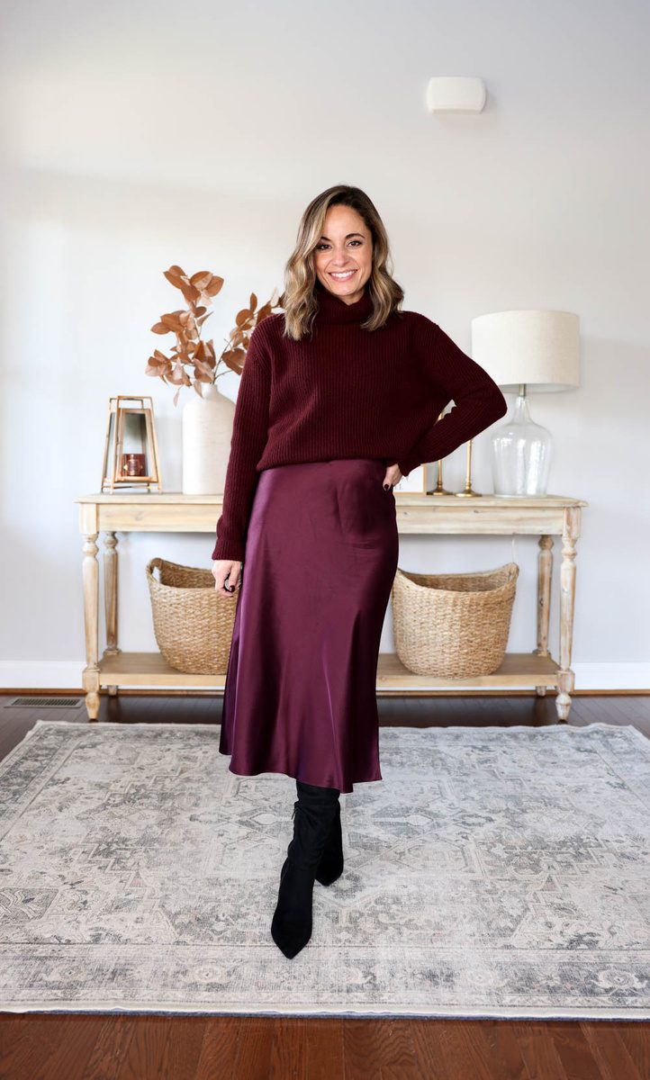Смело достаем атласную юбку из гардероба, ведь мы знаем, как носить ее зимой! Атласный «низ» великолепно комбинируется с рубашками и блузками, вязаными свитерами, высокими сапогами из кожи или замши.