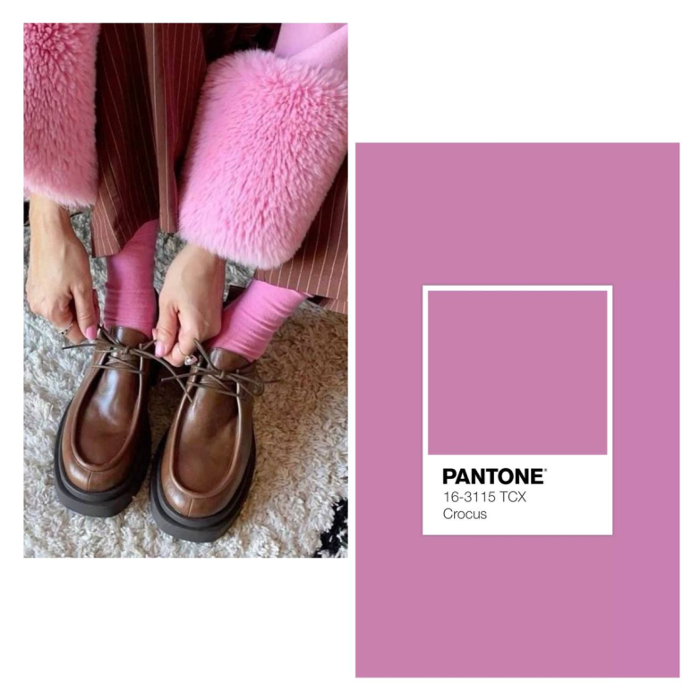 На первый взгляд, розовый. Но на самом деле он ближе к пурпурному. Этот цвет станет отличным акцентом, поэтому смело добавляйте в образ. Обратите внимание как сrocus красиво сочетается с коричневым, если захотите большей яркость — надевайте с красным.