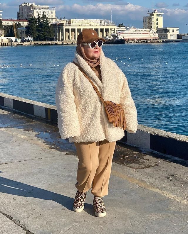 7. Светло-бежевые спортивные брюки и достигающая середины бедра симпатичная шубка молочного оттенка – ансамбль, под которым лишние объемы модной зрелой женщины будут успешно скрыты, а женственность и изысканный вкус подчеркнуты. За эффектность и оригинальность в образе также отвечают ботинки с «леопардовым» принтом на толстой подошве, кофейная сумочка с кисточками и коричневая кепка.