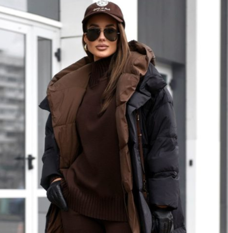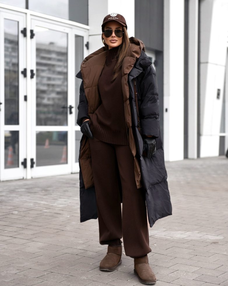 Коричневый цвет любит трикотаж! Посмотрите, как здорово брючный костюм ладит со стеганым пуховиком. Детали: угги, кожаные перчатки, кепка.