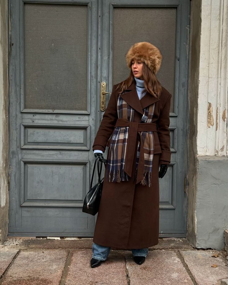 Начнем с простых, понятных комплектов с легким напылением моды 2025 года. Любую базу всегда выручают аксессуарами, а когда на улице холодно их особенно много. Меховые аксессуары являются не только ярким и интересным вариантом, но и очень модным. В образе с прямыми/ широкими джинсами, лаконичным лонгсливом и шерстяным пальто- меховая шапка может стать отражением прохладной, зачастую морозной погоды и наступившей календарной весны.