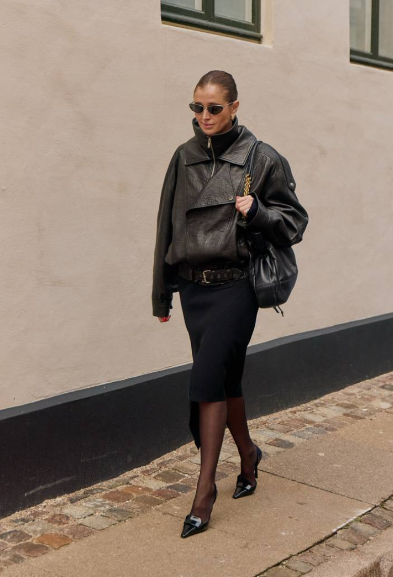 В следующем образе на стыке интересная актуальная фактура кожа и очень модная куртка с воротником стойка, возникает интересный микс изысканной женственности с ноткой современности, не мало важную роль играет обувь на каблуке и очки.
