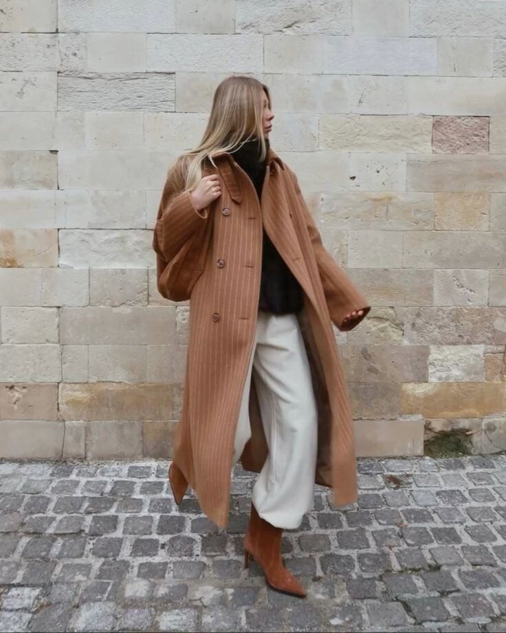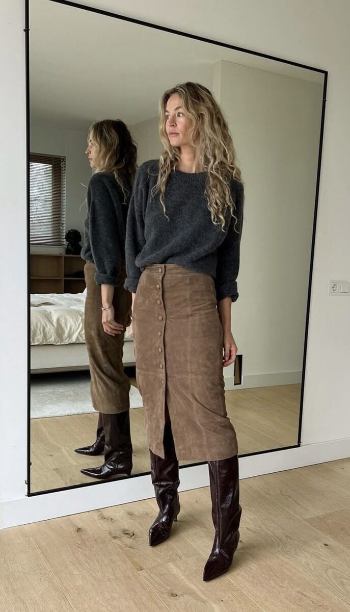 В следующем образе за основу возьмем самую модную фактуру 2025- замшу. Вещи из замши имеют богатую историю, которая начиналась не с моды: за счет высокой прочности и функциональности материала из замши делали куртки и жакеты, а также головные уборы и перчатки, с возвращением общего тренда на стиль 70-х замшевые вещи вернулись на подиумы и улицы.Не смотря на интересность в комплектах может внести модность, но может и перегрузить и испортить. В повседневной жизни лучшее решение спокойный верх джемпер или рубашка, в мягкой контрастности и близкий по цвету, одно из самых модных решение бургунди + коричневый или монохромы.