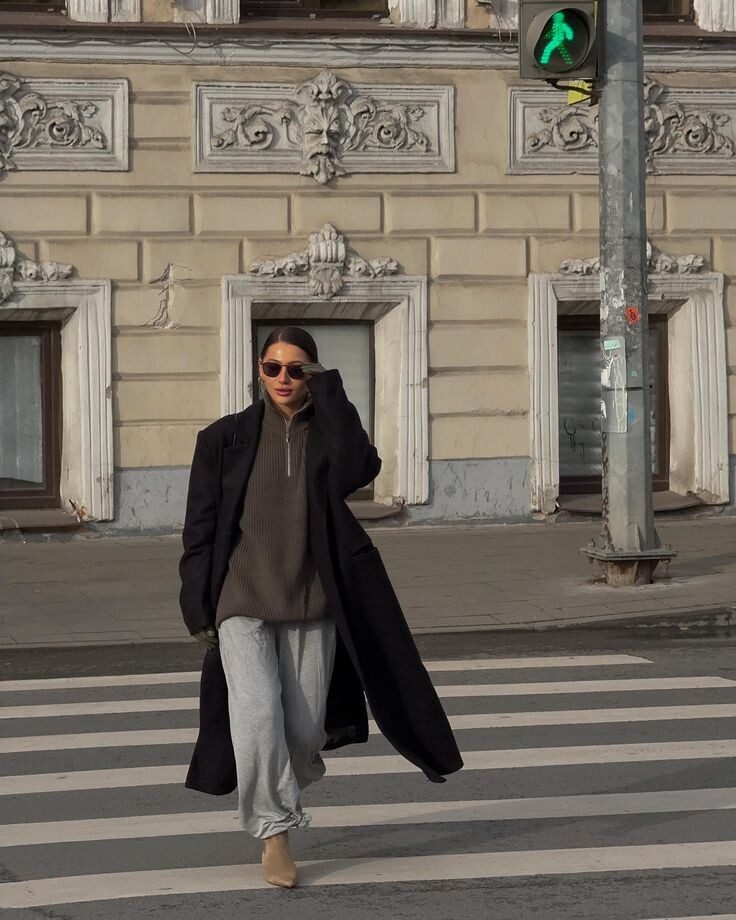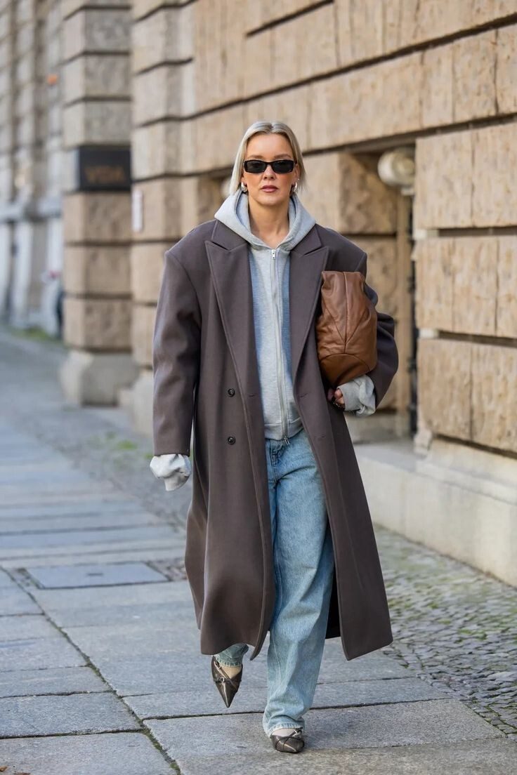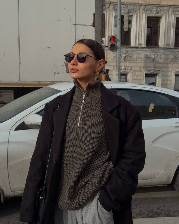 Современный крой и актуальная фурнитура всегда придает образу освежающий вид. Привычные джинсы, ботинки на шнуровке и пальто в комплекте с джемпером на молнии получает интересность и главное столь легкую модную стилизацию заметно и при закрытом пальто и при распахнутом.
