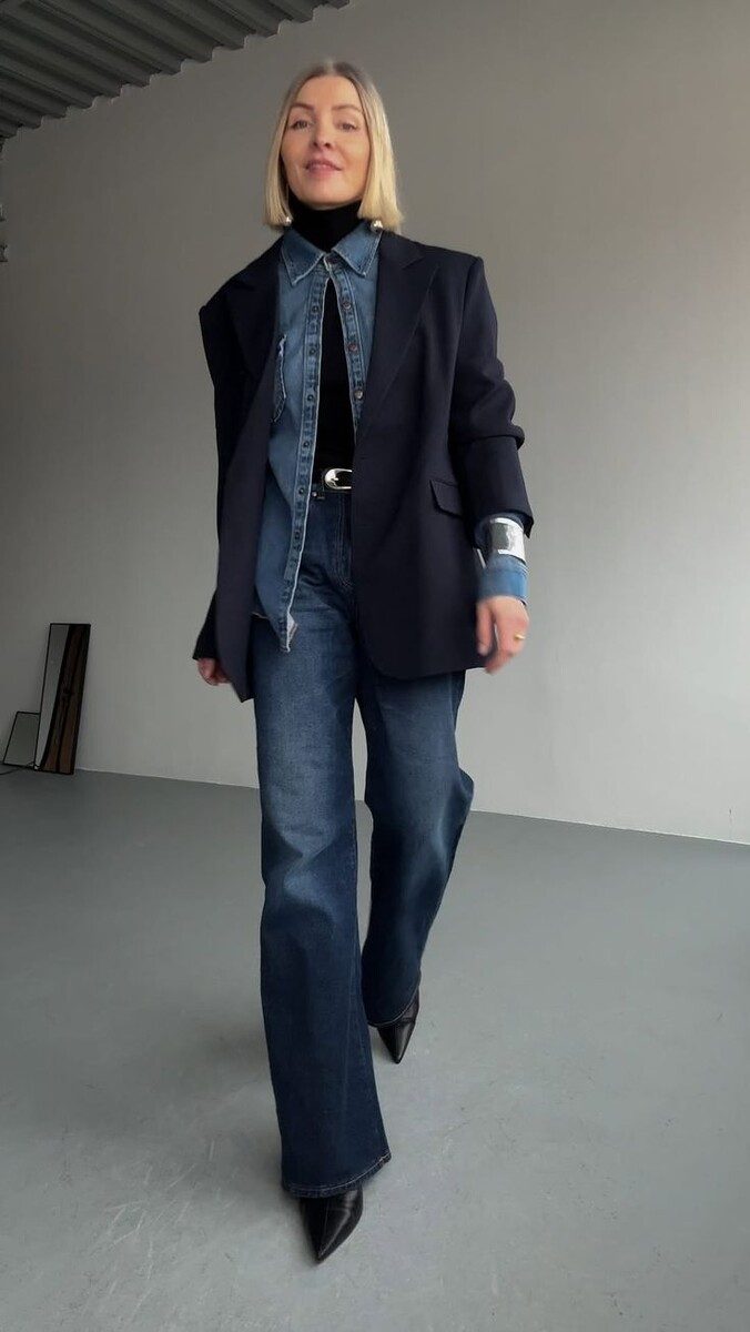 Один из самых практичных и одновременно универсально-удобных вариантов использование в одном образе джинсовой рубашки и джинсы + любая вариация актуальной верхней одежды, прекрасно будет смотряться замша, можно еще уйти в многослойность используя футболку, водолазку, хлопковую рубашку