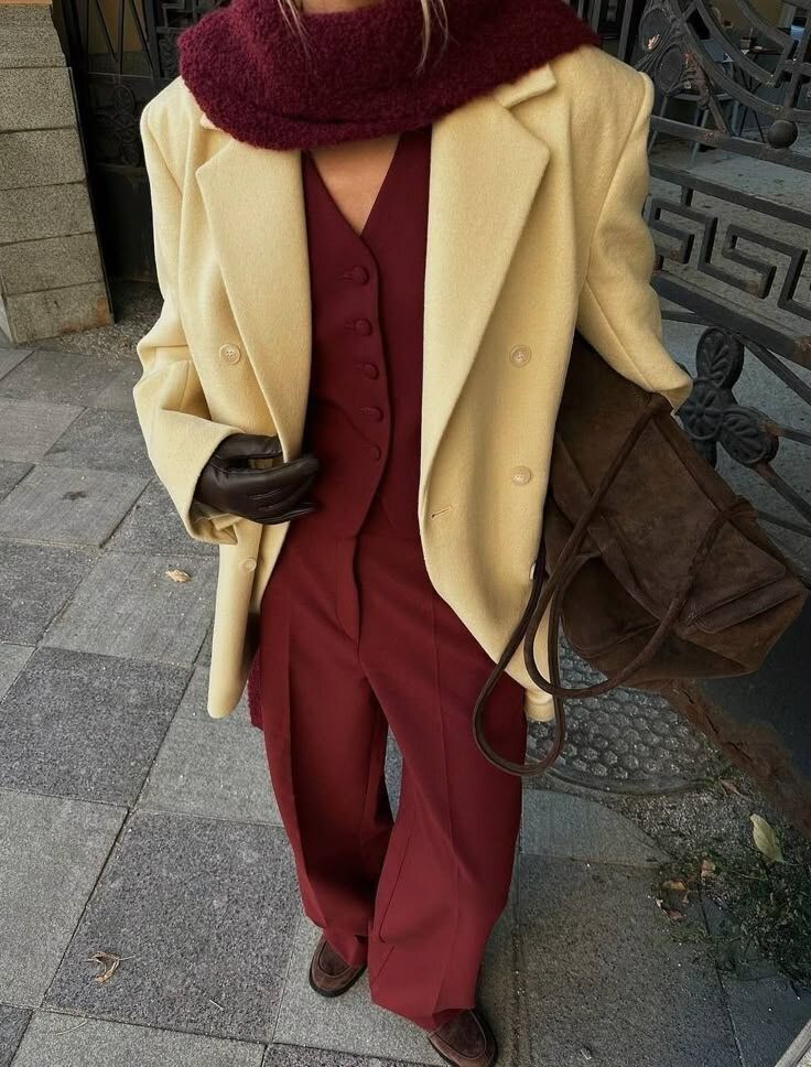 В 2025 году сочетание сливочного масла и бордового в одежде — это хит сезона. Эти два цвета создают удивительно элегантный и при этом современный контраст. Мягкий, теплый оттенок сливочного масла прекрасно нивелирует строгость и глубину бордового, делая образ более универсальным и подходящим для различных ситуаций.