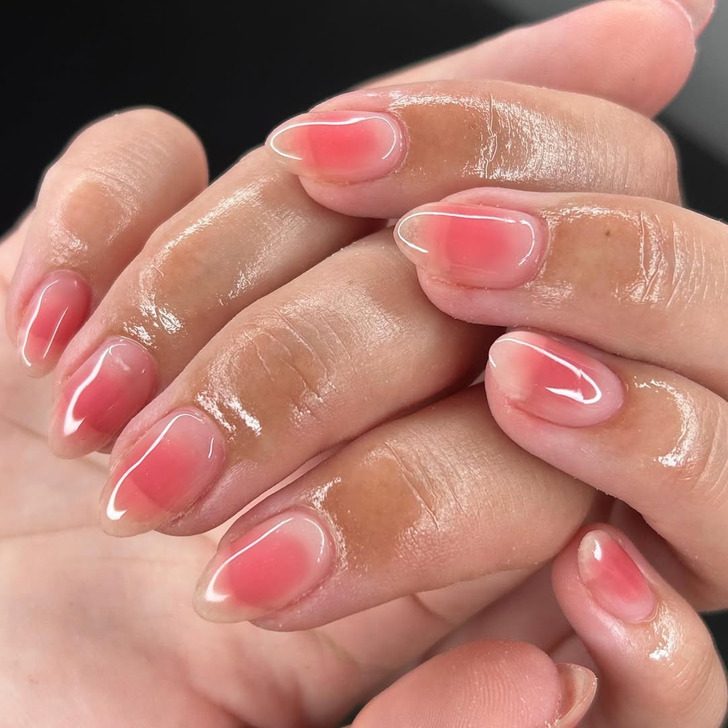 Для любителей романтики отлично подходит дизайн ногтей с румянами. Мастер создает плавный градиент, за счет переходов от нежно-розового к ярко-розовому, аккуратно растушевывая оттенки с помощью мягкой губки.