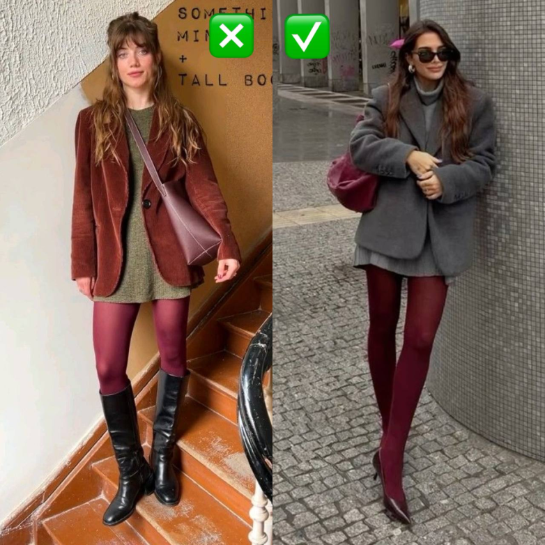 Бордовые колготки сейчас очень популярны. Но их не так просто стилизовать. С черными сапогами, как на первом фото, они будут смотреться тяжело. Да и попытка сочетать их с вещами других ярких цветов тоже неудачна. Лучше взять бордовую обувь, а остальные детали образа выбрать в нейтральной гамме.