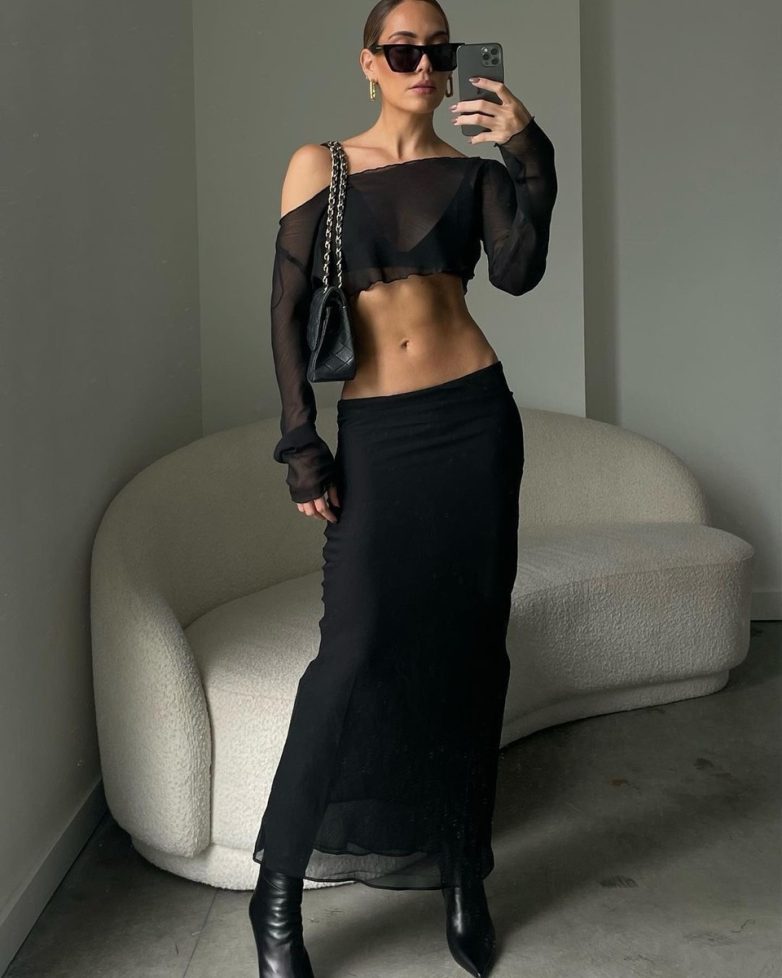 То, что юбка смотрится хорошо с блузой – это база. Но чтобы быть по-настоящему трендовой, выбирай полупрозрачные блузы или майки. Настоящий шик в стиле Yves Saint Laurent.