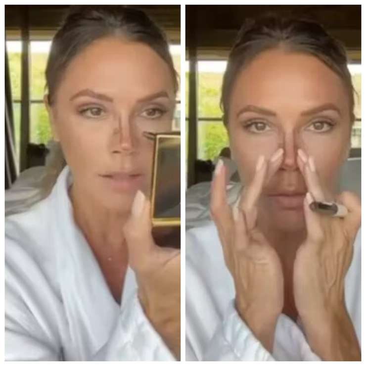 Начинать невидимое контурирование Виктория предлагает с той части лица, которая в ее случае не оставляет в покое журналистов, то есть, с носа. Она демонстрирует, как сделать нос точеным и аккуратным, даже если от природы он очень широкий и длинный.
