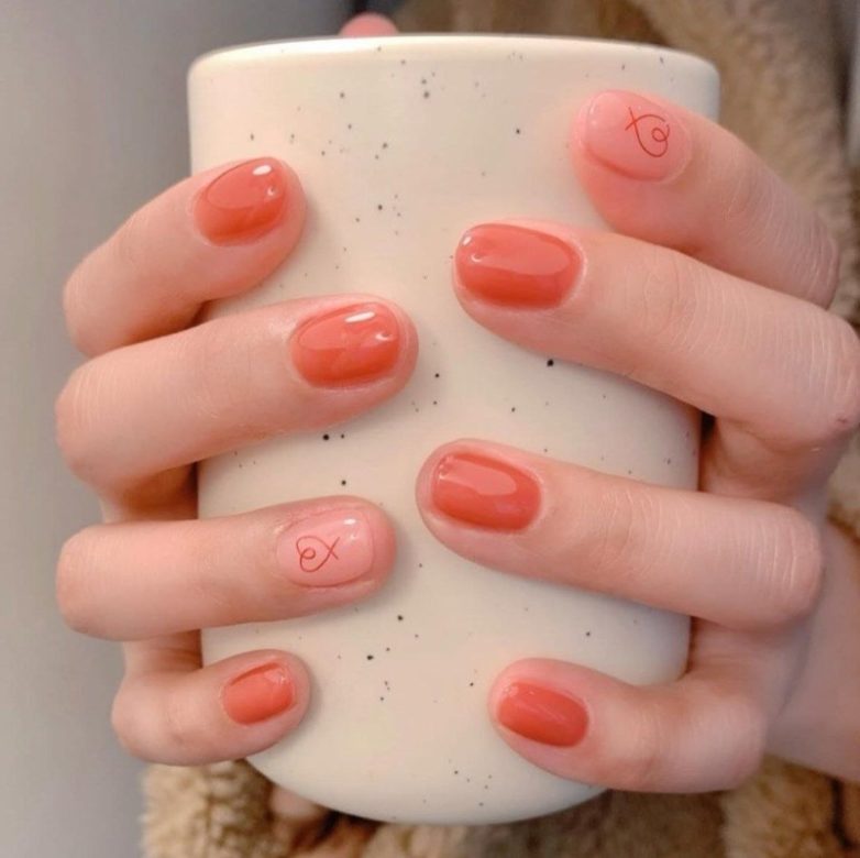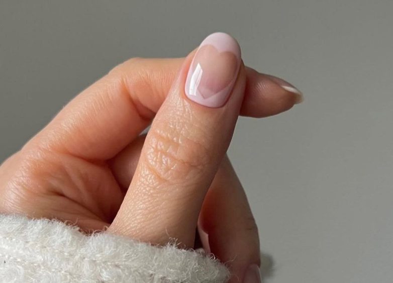 Интересная идея нежного маникюра для тех, кто любит нюдовое покрытие, – молочно-розовые ногти с «пустыми» сердцами внутри. Стильно, подходит под любой дресс-код – и на свадьбу, и на свидание, и в офис.