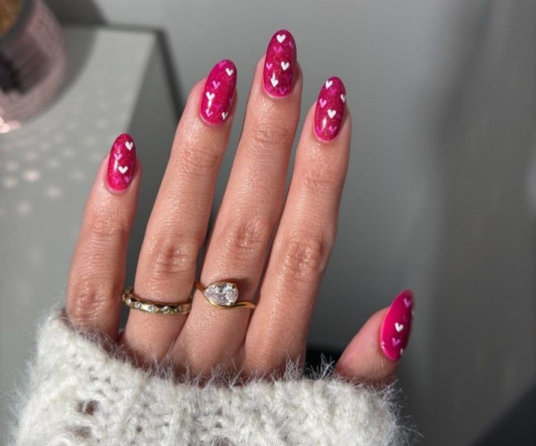 Мелкие сердечки отлично выглядят на ногтях ягодных оттенков: выбирайте для узора контрастные цвета, сочетающиеся с тоном основного покрытия.