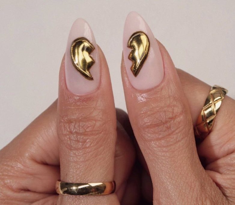 Дизайн для тех, кто встречает День святого Валентина в одиночестве, ну либо просто любит креативные решения – маникюр с большими пальцами, украшенными половинками разбившихся сердец.