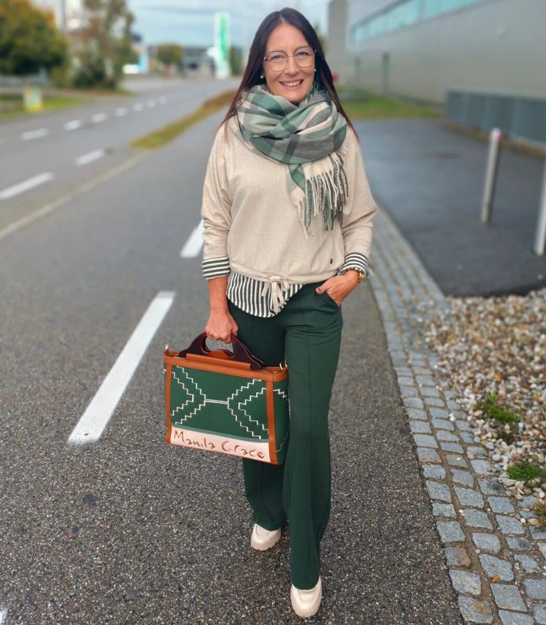 Уютный многослойный сет составить легко и просто! Полосатая рубашка + джемпер + изумрудные брюки + лоферы + объемные аксессуары – красиво и свежо!