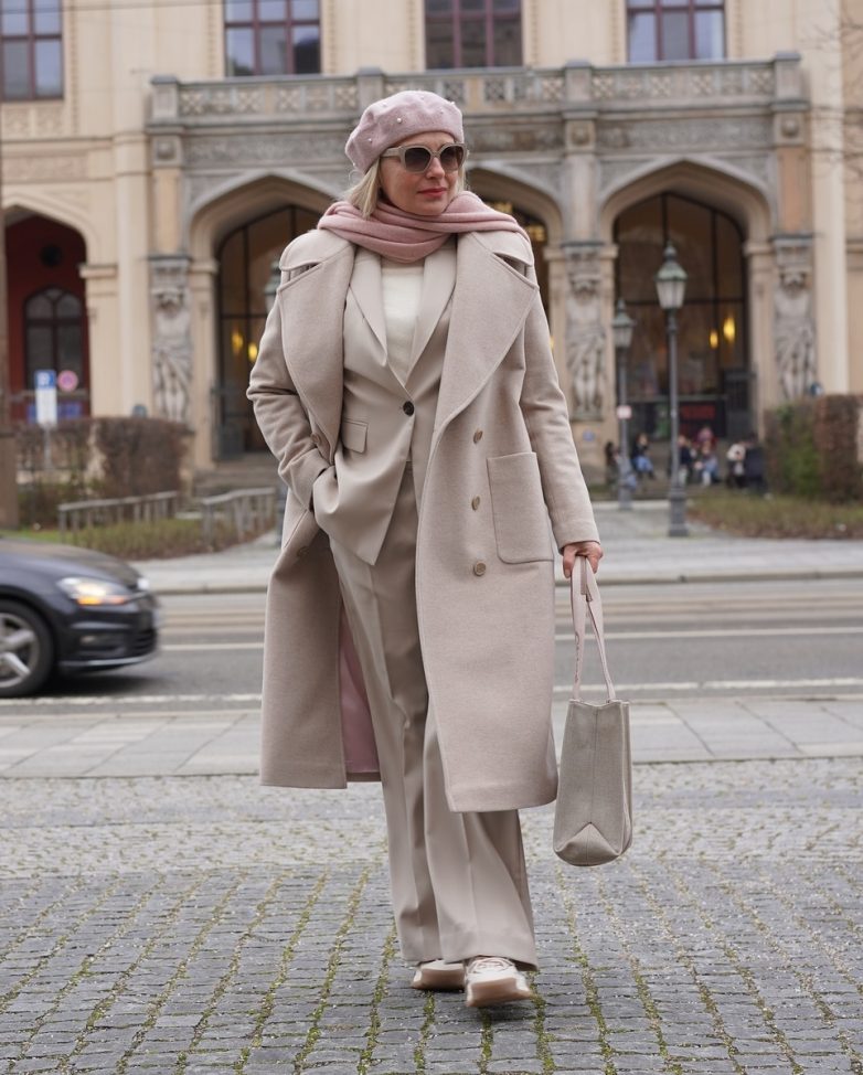 Наряд в пастельных тонах – само очарование! Светлый беж в дуэте с нежным пудровым цветом выгодно омолаживает внешность и образ в целом.