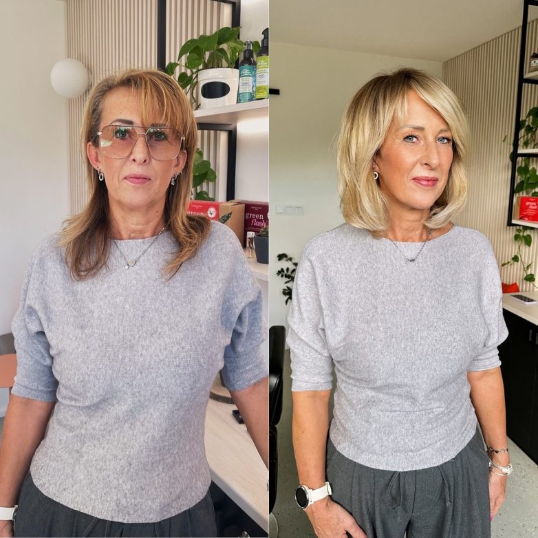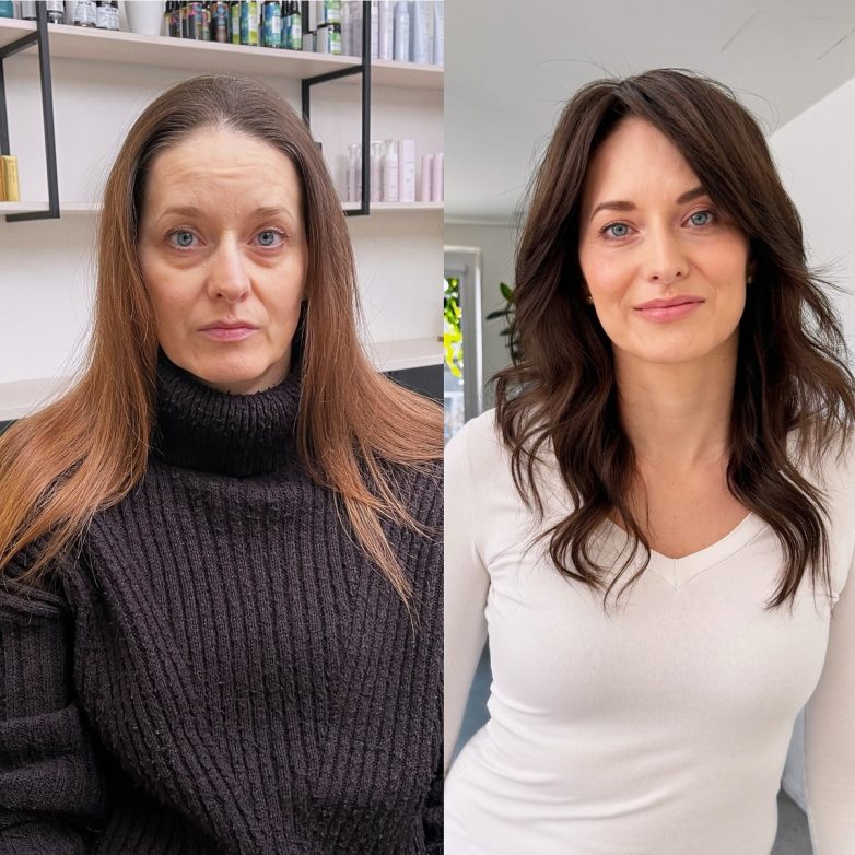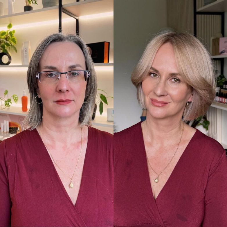 Стрижка моментально преобразила женщину, длина волос осталась прежней. Макияж выровнял тон кожи, сделал ее гладкой и подсвеченной.