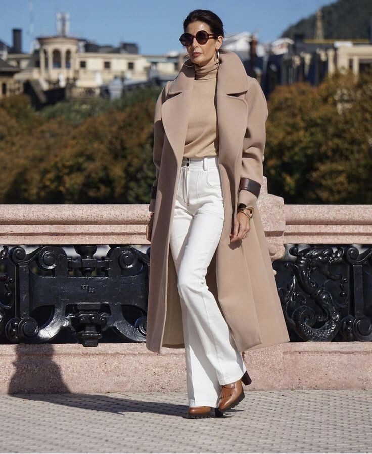 Ахроматический белый цвет и нейтральный беж – простой дуэт, который успокаивает и не перегружает образ. Базовая водолазка, брюки-клеш, лаконичное пальто, ботильоны на устойчивом каблуке, бижутерия и ничего лишнего!