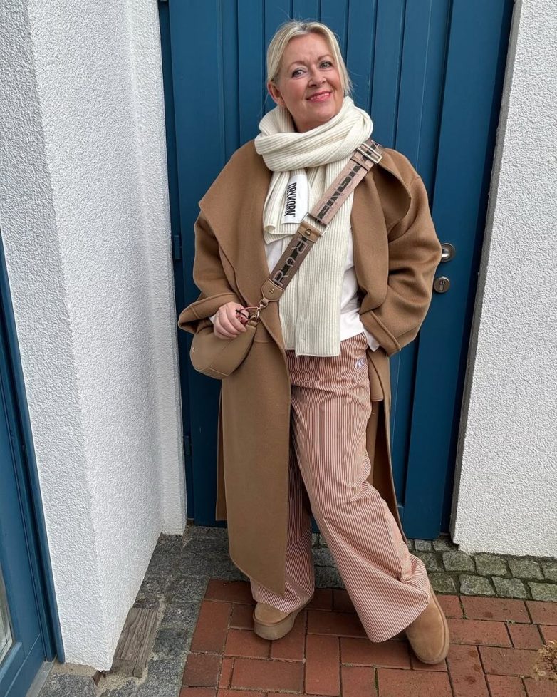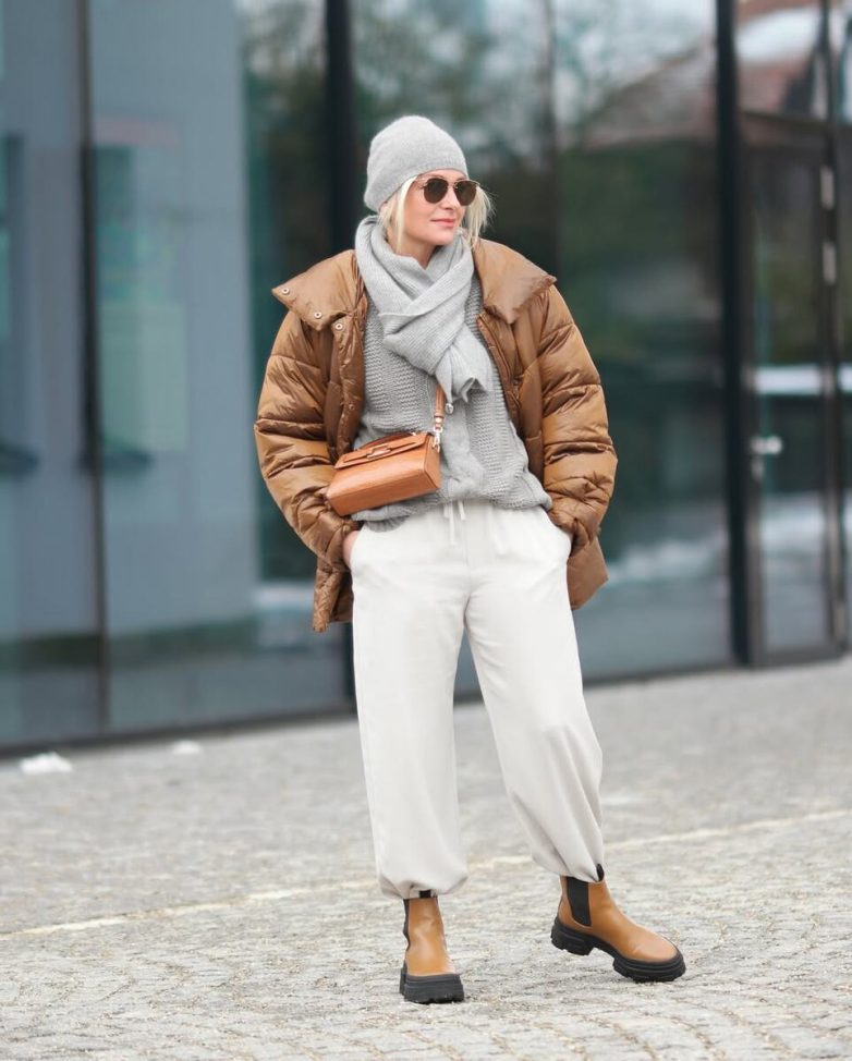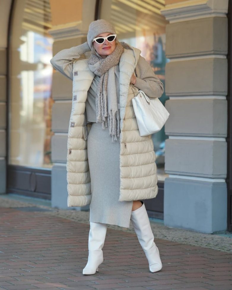 Стеганое пальто-пуховик или утепленный жилет светлого оттенка — отличный выбор для весенней погоды. Оно сочетается с трикотажным костюмом в тон и объемным шарфом, создавая уютный и гармоничный комплект. Белые сапоги и сумка добавляют образу свежести и визуально «облегчают» его. Этот образ показывает, как можно сочетать комфорт и тренды, оставаясь элегантной даже в прохладную погоду.