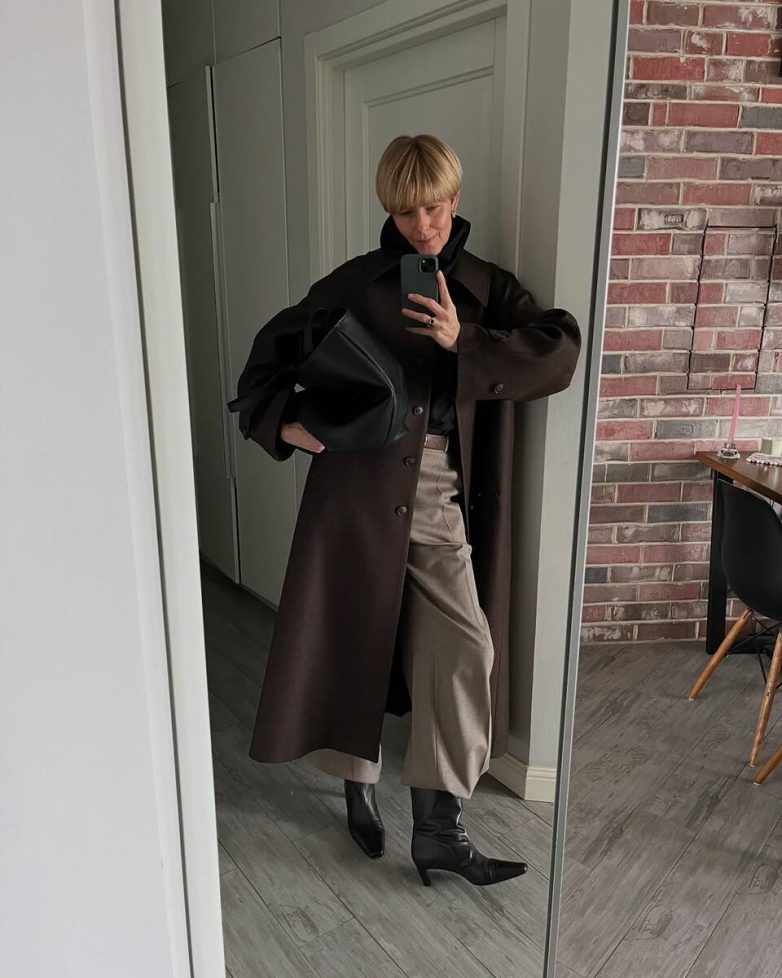 Посмотрите, как элегантно смотрится темно-коричневое пальто. Оно отлично сочетаются с брюками палаццо. Большая сумка в данном случае – заметный акцент, который добавляет образу «перчинки», не переходя грань элегантности. А сапоги на небольшом каблучке создают более строгий и сдержанный образ. Пальто – это вообще универсальная вещь, которая согреет и украсит – настоящая находка для весеннего гардероба.