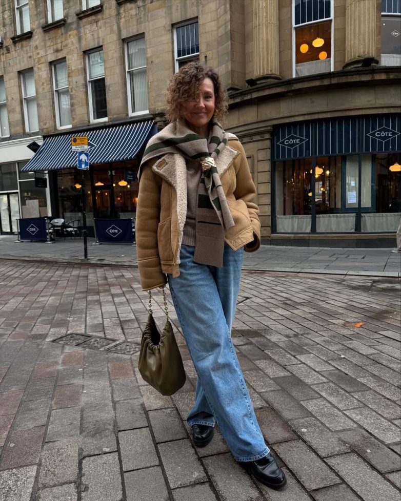 Короткая дубленка-авиатор – трендовая и теплая вещь, которая отлично сочетается с базовыми голубыми джинсами прямого кроя. Многослойность создается за счет свитера и объемного шарфа из свитера в полоску – практичное решение для переменчивой погоды, а интересная брошь добавляет акцент. Такой комплект подойдет и для встречи с друзьями, и для похода по магазинам.