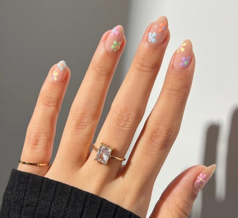 Цветы разных пастельных оттенков, нарисованные на бежево-нюдовой базе, – романтичный маникюр с весенним вайбом, который повышает настроение.