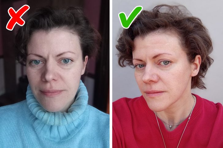 Любое окно в доме, если в него попадает солнечный свет, отлично подойдет. Главное — расположиться прямо напротив него, а не становиться боком, иначе на лице появятся резкие тени. Если съемка проходит в вечернее время, лучше выбрать источник света, расположенный на уровне лица. Освещение от потолочной люстры, к сожалению, безжалостно подчеркивает любые возможные несовершенства кожи.