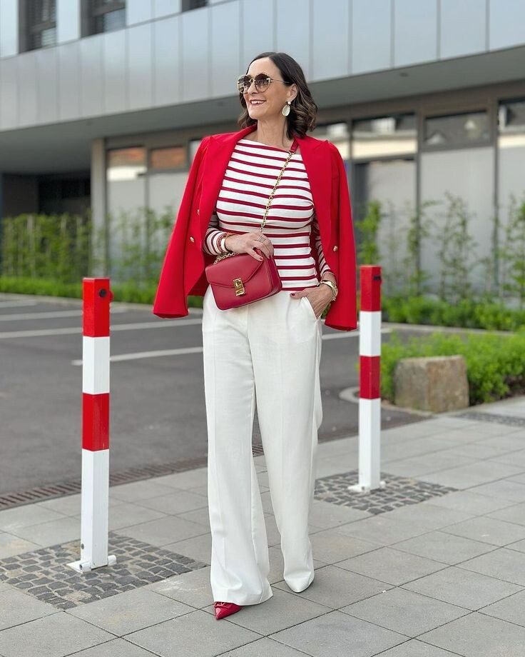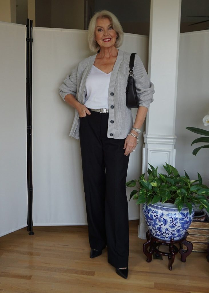 При желании белые брюки можно вписать в монохромный наряд. Утонченная блузка, брюки, остроносые туфли, аксессуары, лаконичные украшения и ничего лишнего!