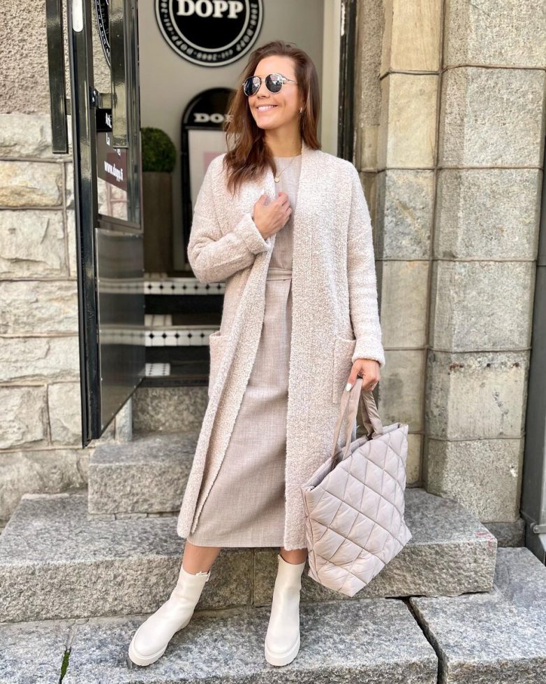 Монохром – удачная идея для леди 50+. Бежевый кардиган, платье миди, ботинки, вместительная сумка и ничего лишнего!