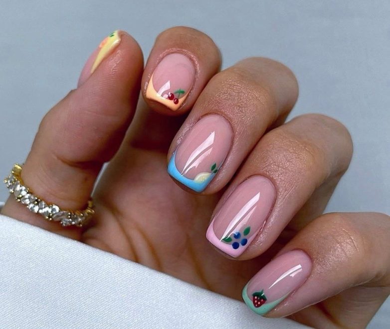 Разноцветный френч с миниатюрными рисунками ягод и фруктов – нежный маникюр, заряженный на хорошее настроение.